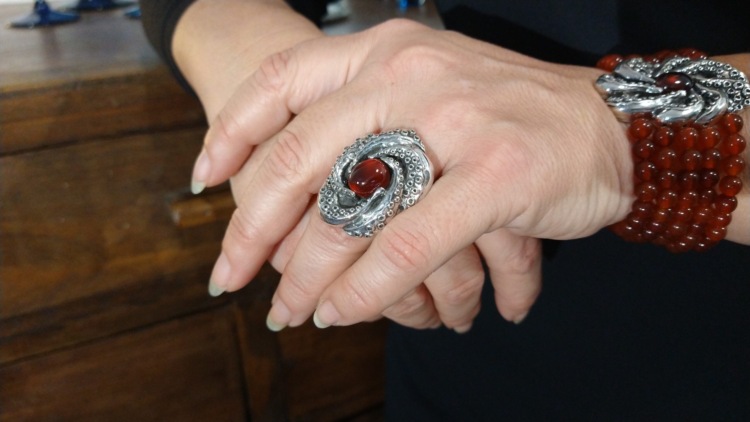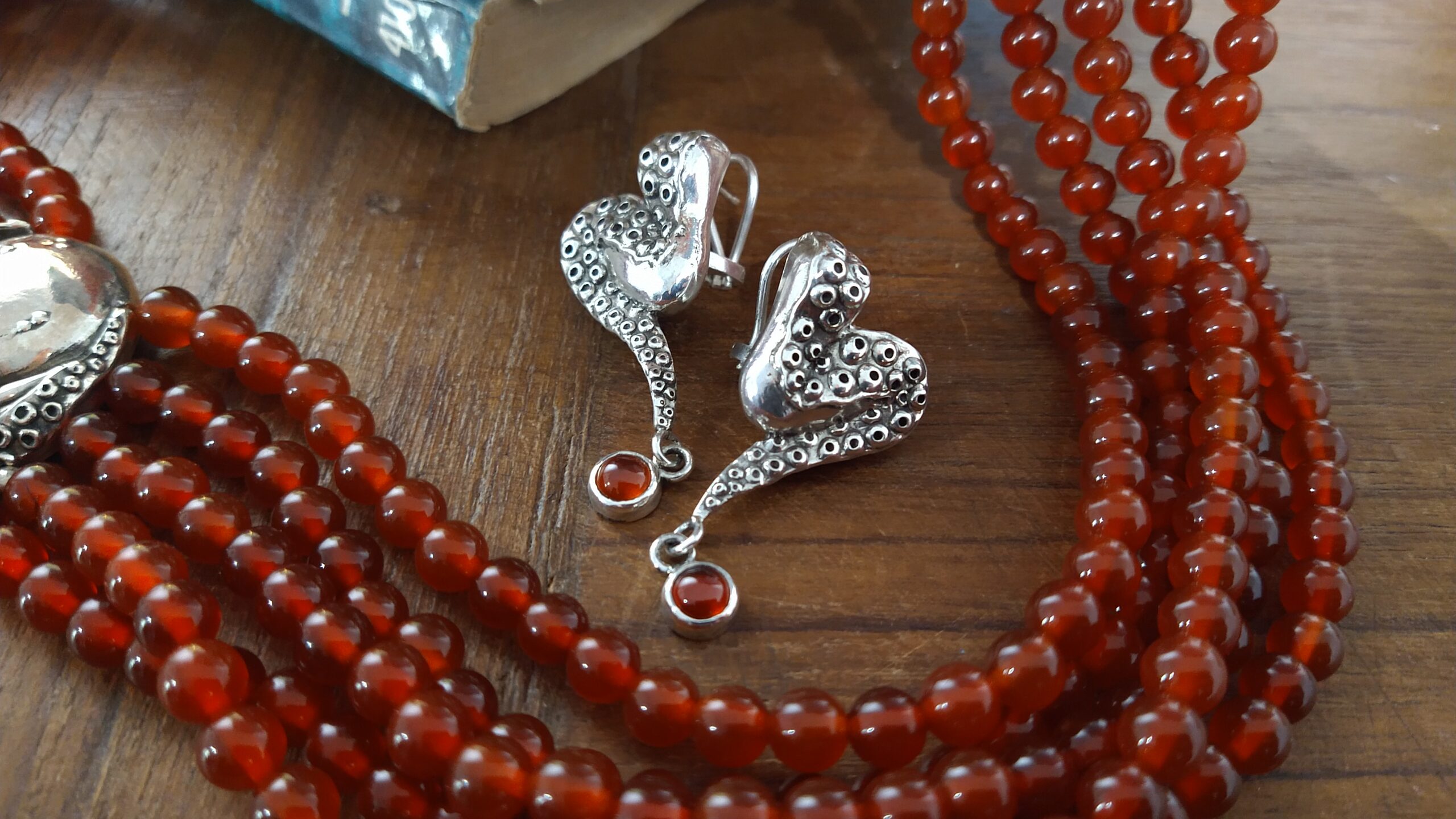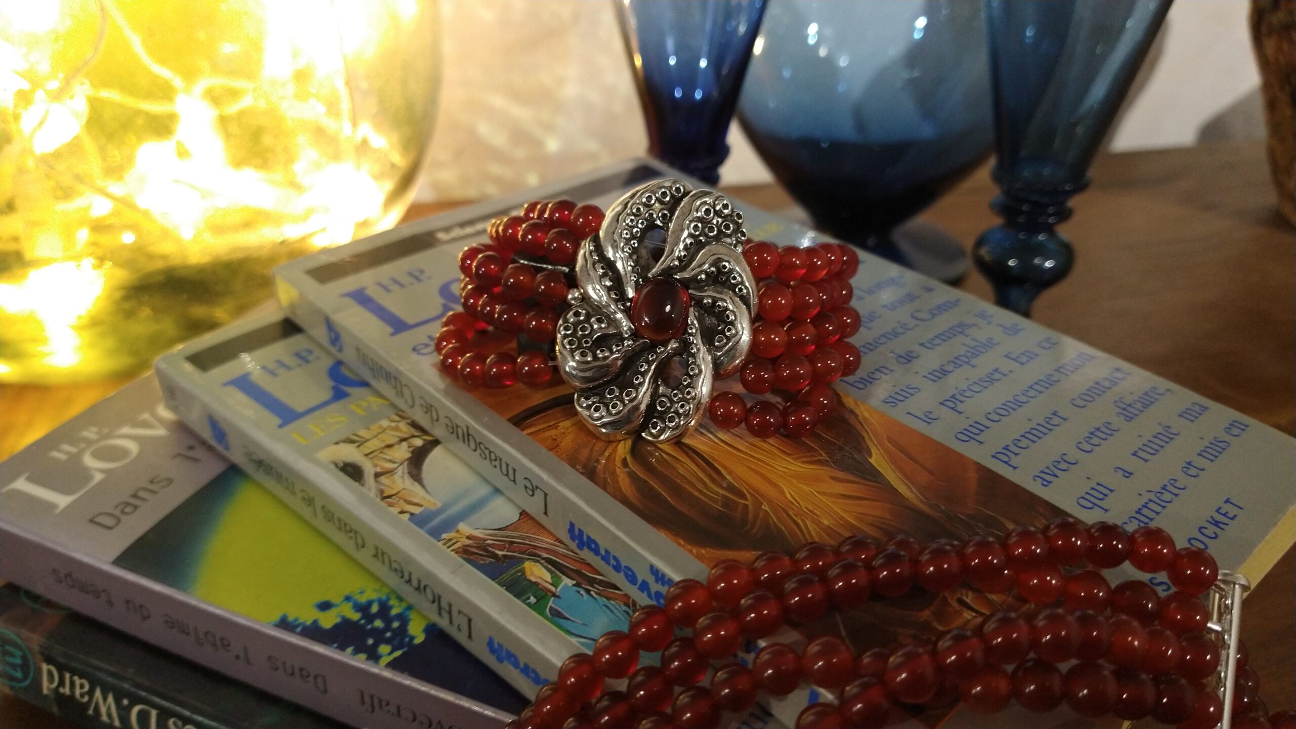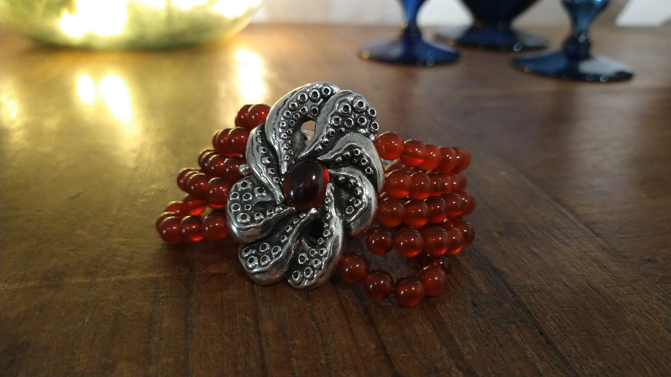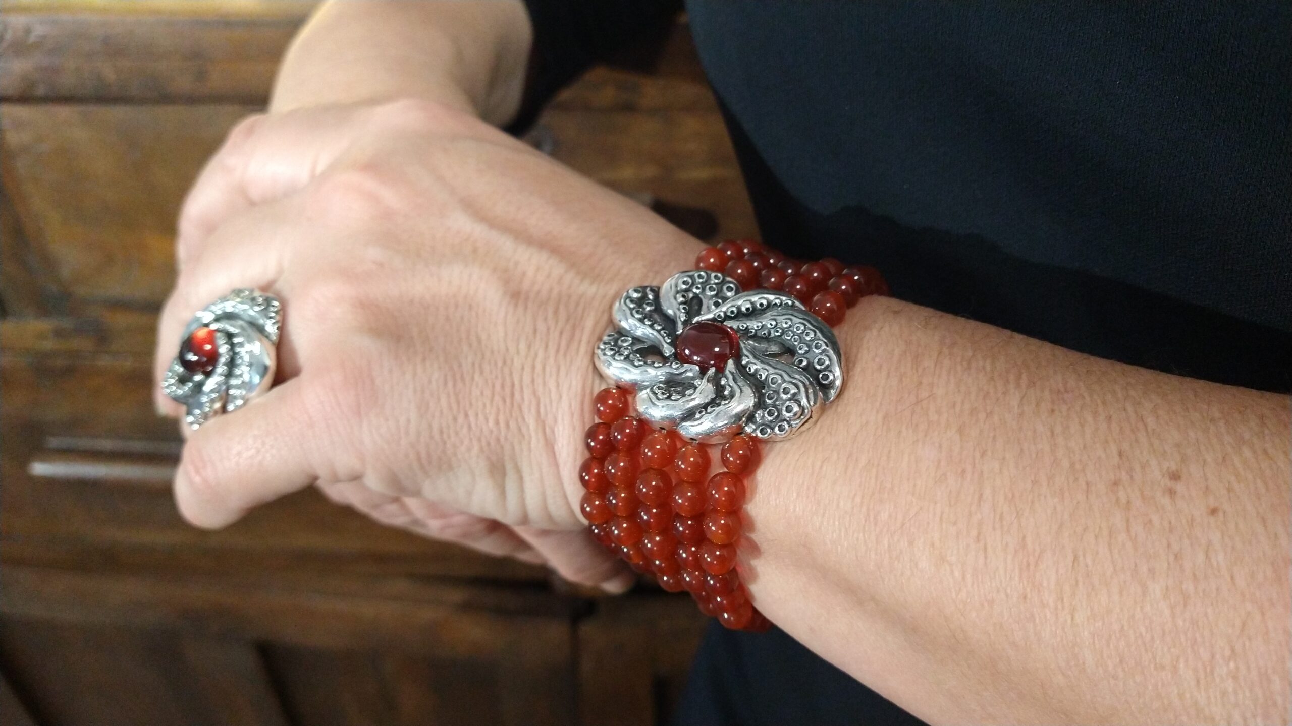 Les cinq rangs d’agate, translucides et changeantes, s’enroulent autour du poignet comme des chapelets d’oeufs autour d’un naufrage. Au cœur de ce tourbillon, les tentacules d’argent d’une créature cachée se déploient, enserrant un cabochon de grenat rouge-orangé — œilleton ardent dans la nuit abyssale, lueur hypnotique qui attire et terrifie à la fois. Le grenat, pierre de feu et de passion, contraste avec le froid métallique des tentacules, rappelant ces lueurs étranges qui dansent parfois dans les eaux noires, signes d’une présence indicible. Ce bracelet est une invitation à écouter l’appel des profondeurs, à sentir le poids des mystères qui s’accrochent à vous, et à oser porter sur soi l’écho des légendes que même les marins n’osent plus conter.