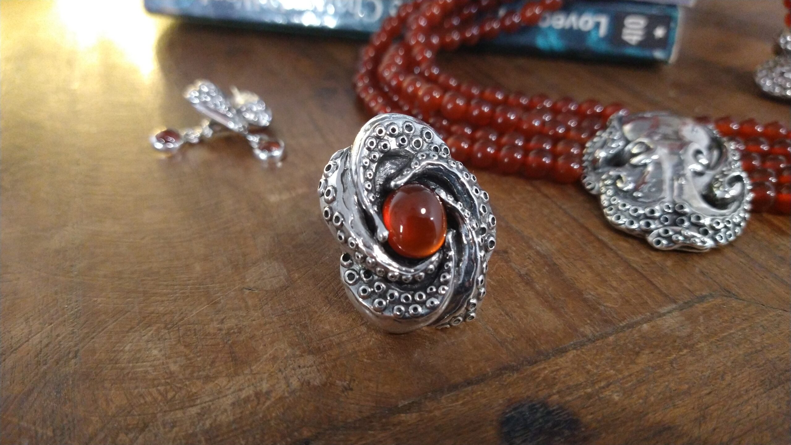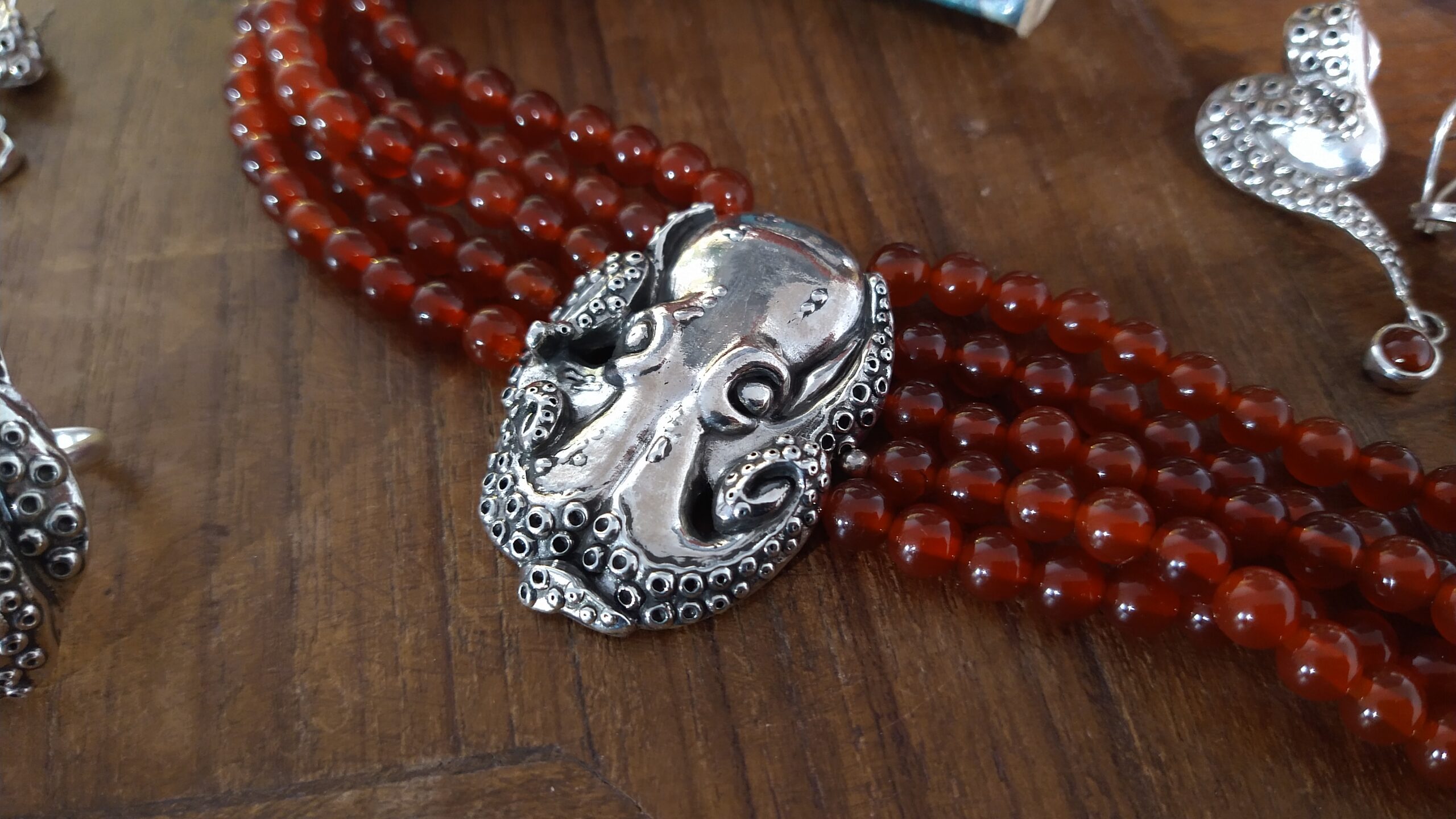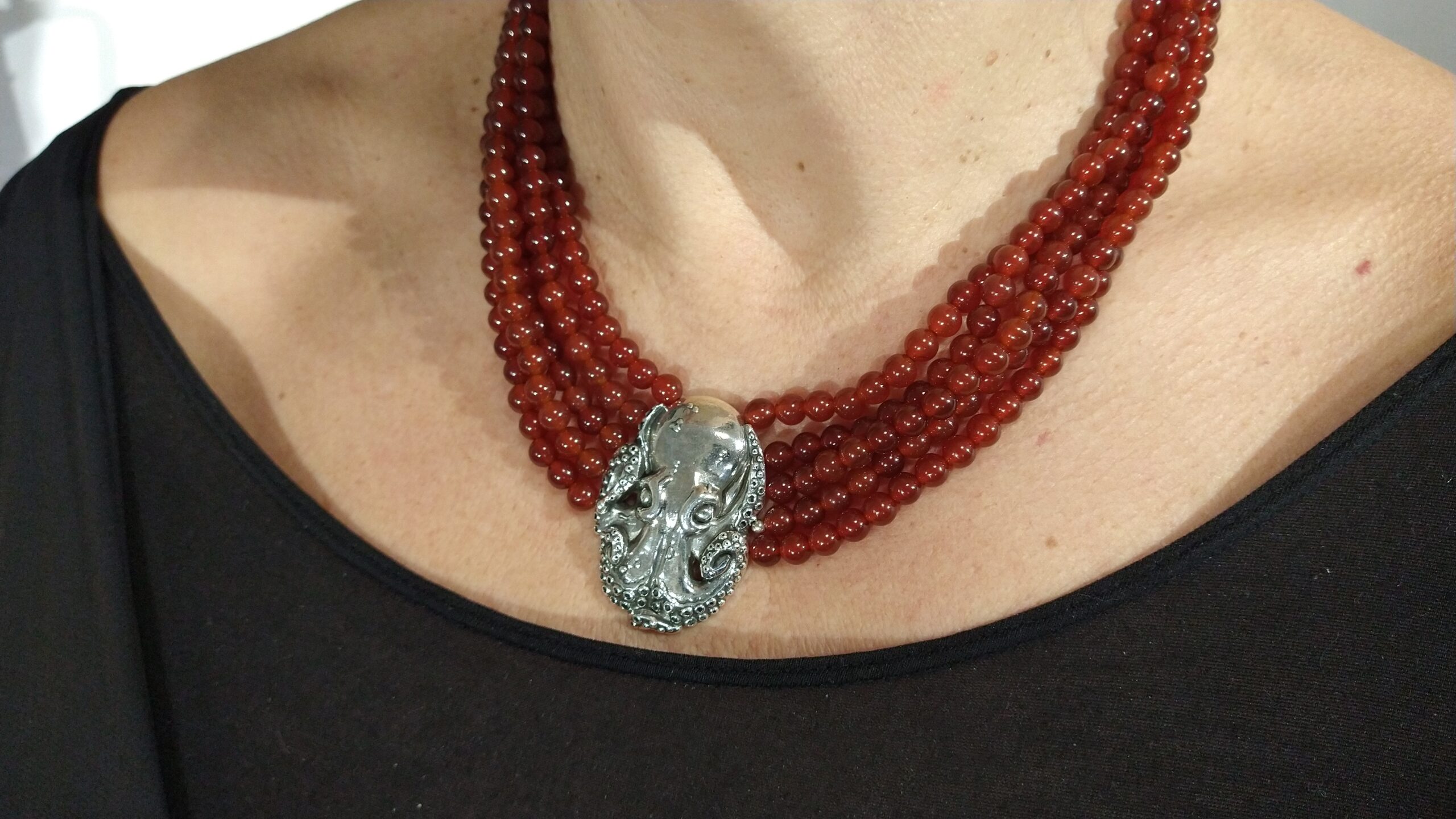 Cinq rangs de perles d’agate, comme autant de filaments traçant la descente vers l’inconnu, enserrent une pieuvre tranquille faite d’argent. Les rangs de perles d’agate d’un rouge-orangé palpitant, évoquent les chapelets d’œufs de la pieuvre, cette matière organique et secrète où la vie se love dans l’ombre, entre promesses et mystères abyssaux. La lumière se brise en reflets trompeurs, tandis que la créature centrale semble émerger des ténèbres, gardienne de ses propres mystères. Porter ce collier, c’est arpenter la frontière entre deux mondes : celui, rassurant, de la surface, et celui, insondable, où rôdent les formes que l’esprit humain ne saurait nommer. L’argent, froid et vivant, capture l’éclat fugace des choses qui ne devraient pas exister — et pourtant, elles sont là, lovées contre votre peau, murmurant des secrets venus des profondeurs.