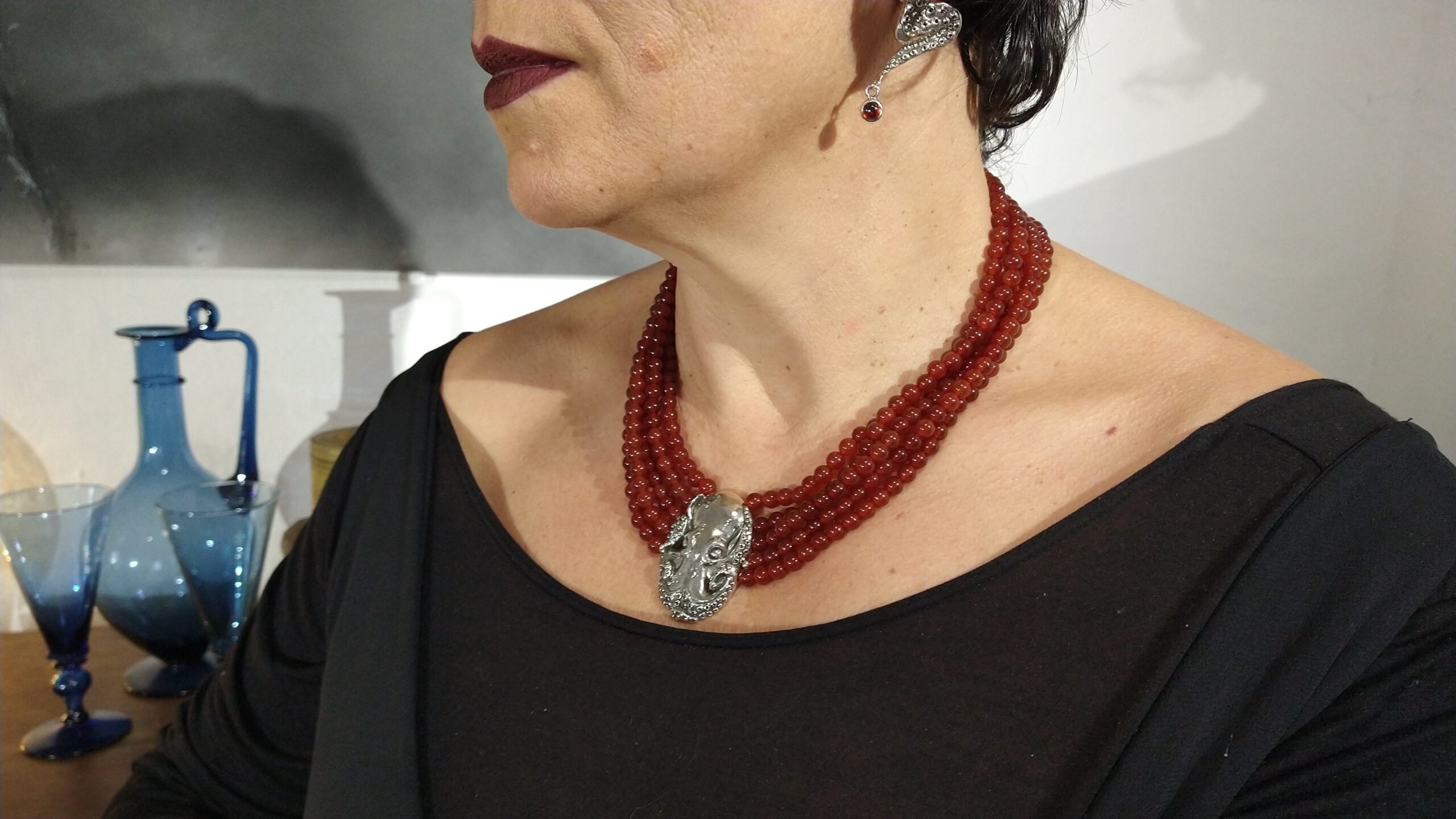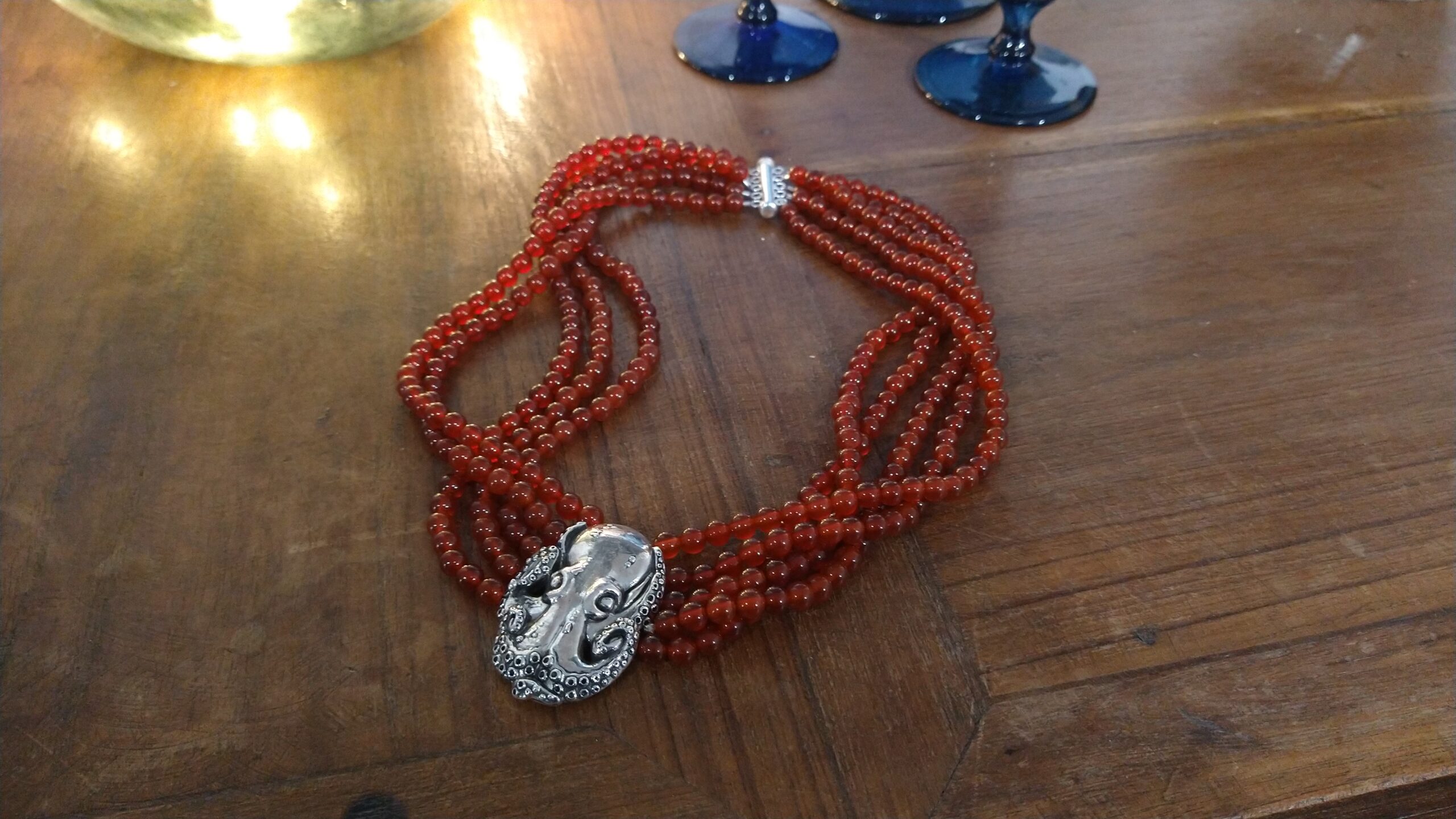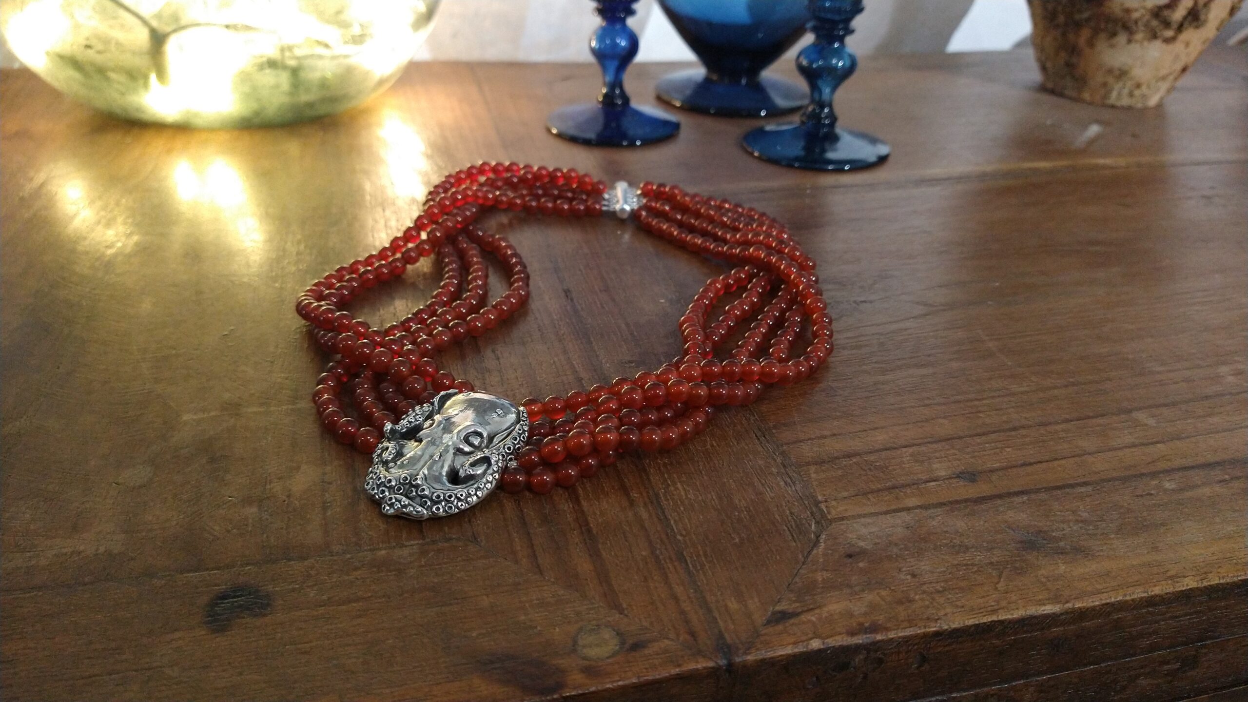 Cinq rangs de perles d’agate, comme autant de filaments traçant la descente vers l’inconnu, enserrent une pieuvre tranquille faite d’argent. Les rangs de perles d’agate d’un rouge-orangé palpitant, évoquent les chapelets d’œufs de la pieuvre, cette matière organique et secrète où la vie se love dans l’ombre, entre promesses et mystères abyssaux. La lumière se brise en reflets trompeurs, tandis que la créature centrale semble émerger des ténèbres, gardienne de ses propres mystères. Porter ce collier, c’est arpenter la frontière entre deux mondes : celui, rassurant, de la surface, et celui, insondable, où rôdent les formes que l’esprit humain ne saurait nommer. L’argent, froid et vivant, capture l’éclat fugace des choses qui ne devraient pas exister — et pourtant, elles sont là, lovées contre votre peau, murmurant des secrets venus des profondeurs.
