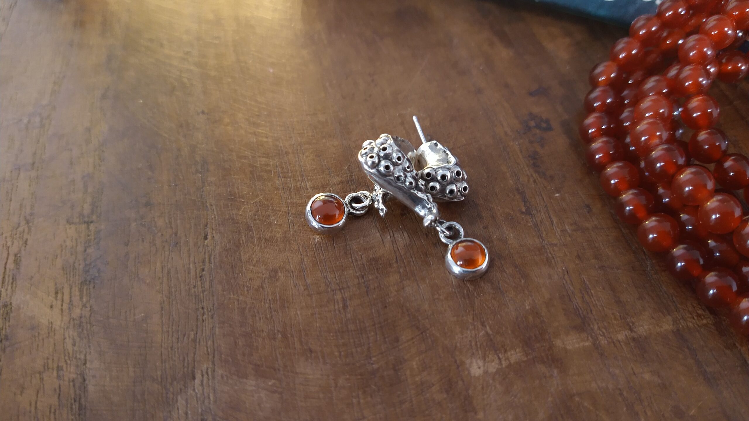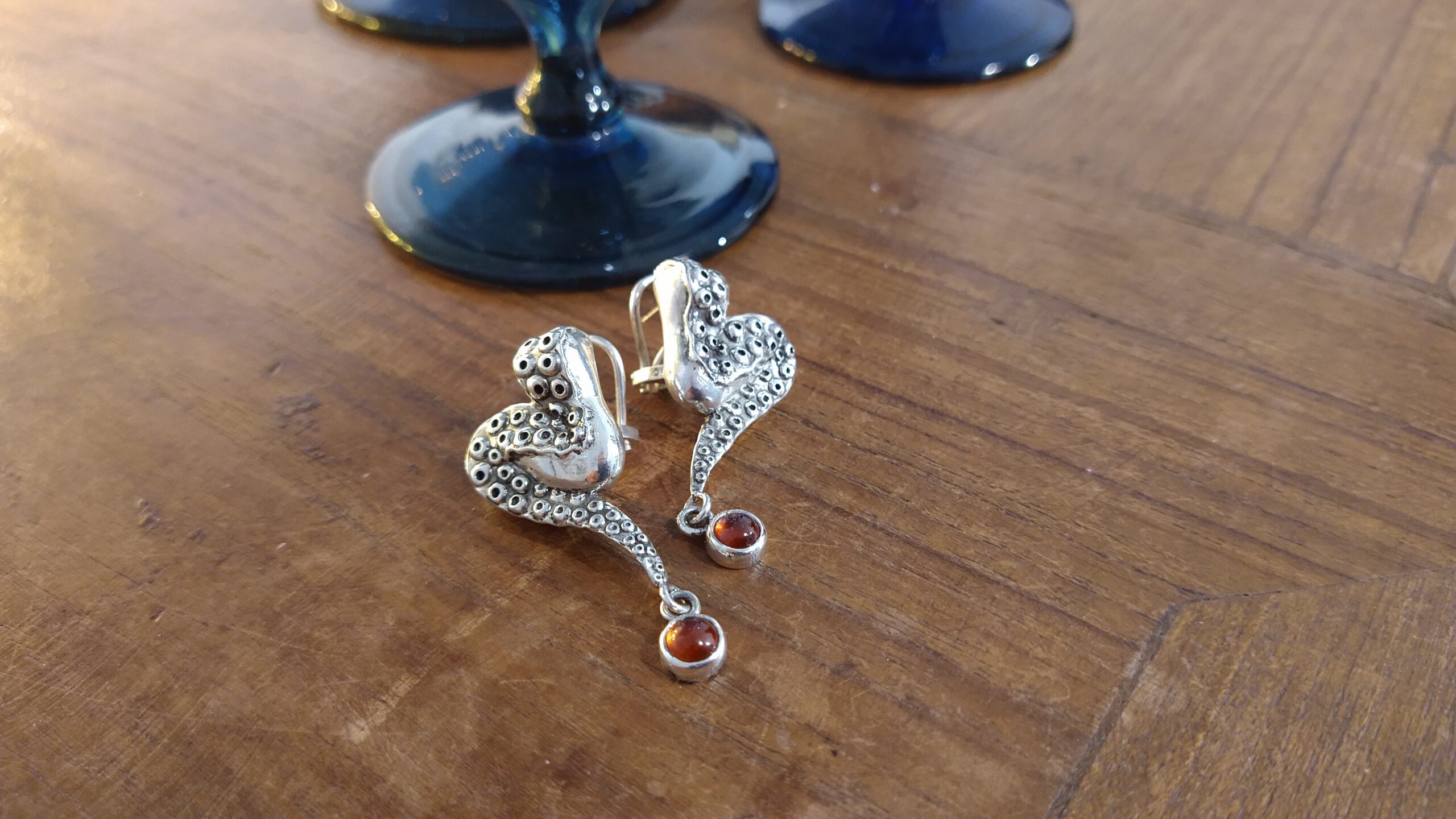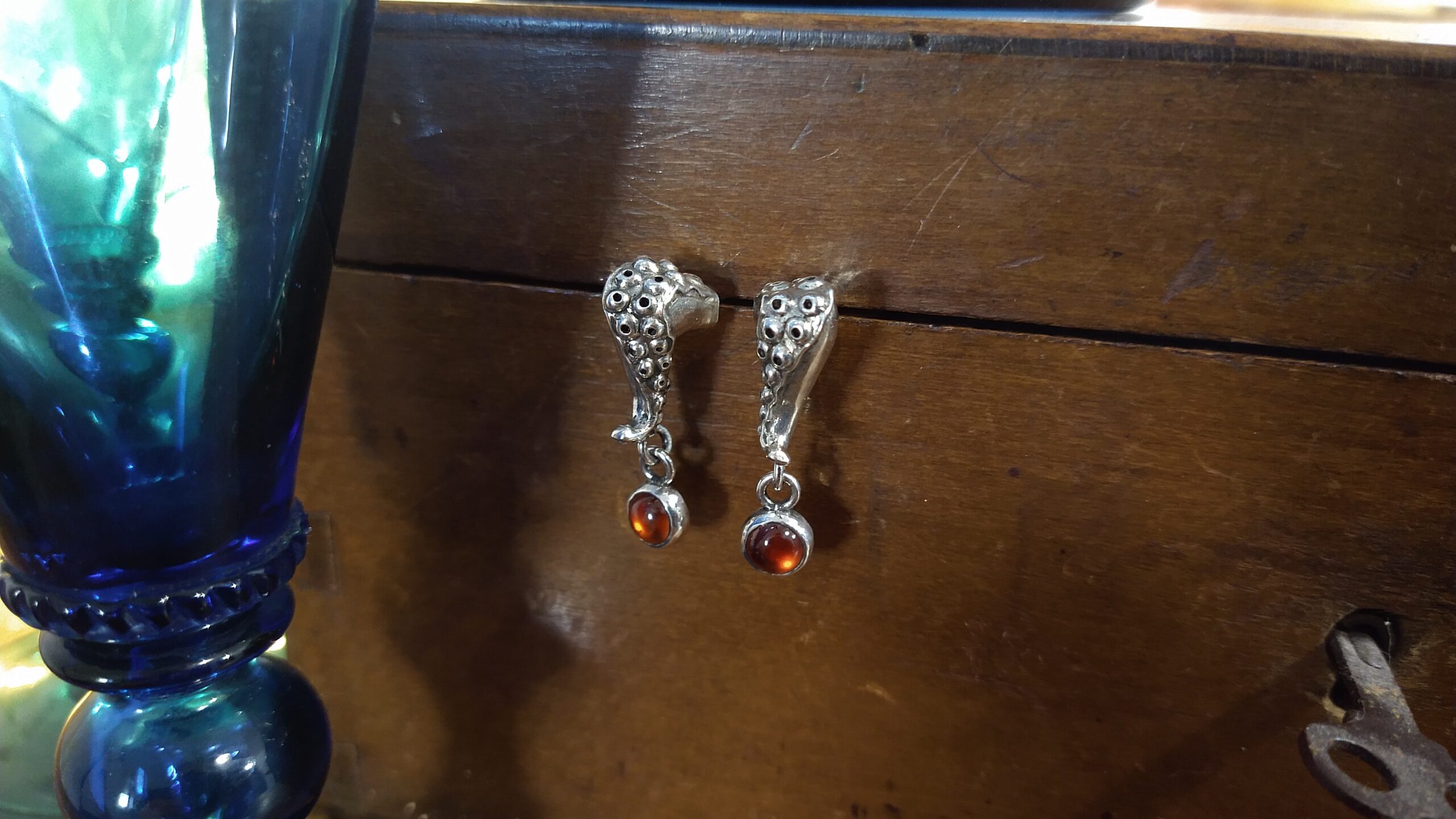 Deux minuscules tentacules d’argent, délicats et sinueux, s’échappent de votre oreille pour se terminer par une pendeloque de grenat rouge-orangé. Comme un clin d’œil des profondeurs, ces bijoux discrets évoquent la présence insaisissable de ce qui rôde dans l’ombre, la danse lente d’une créature des abysses venue frôler la surface. Le grenat, éclat de lumière dans la nuit, rappelle ces reflets trompeurs qui attirent l’œil vers l’inconnu. Porter ces puces, c’est garder près de soi un fragment des mystères marins, une trace de l’indicible qui murmure à peine, mais ne vous quitte jamais tout à fait.