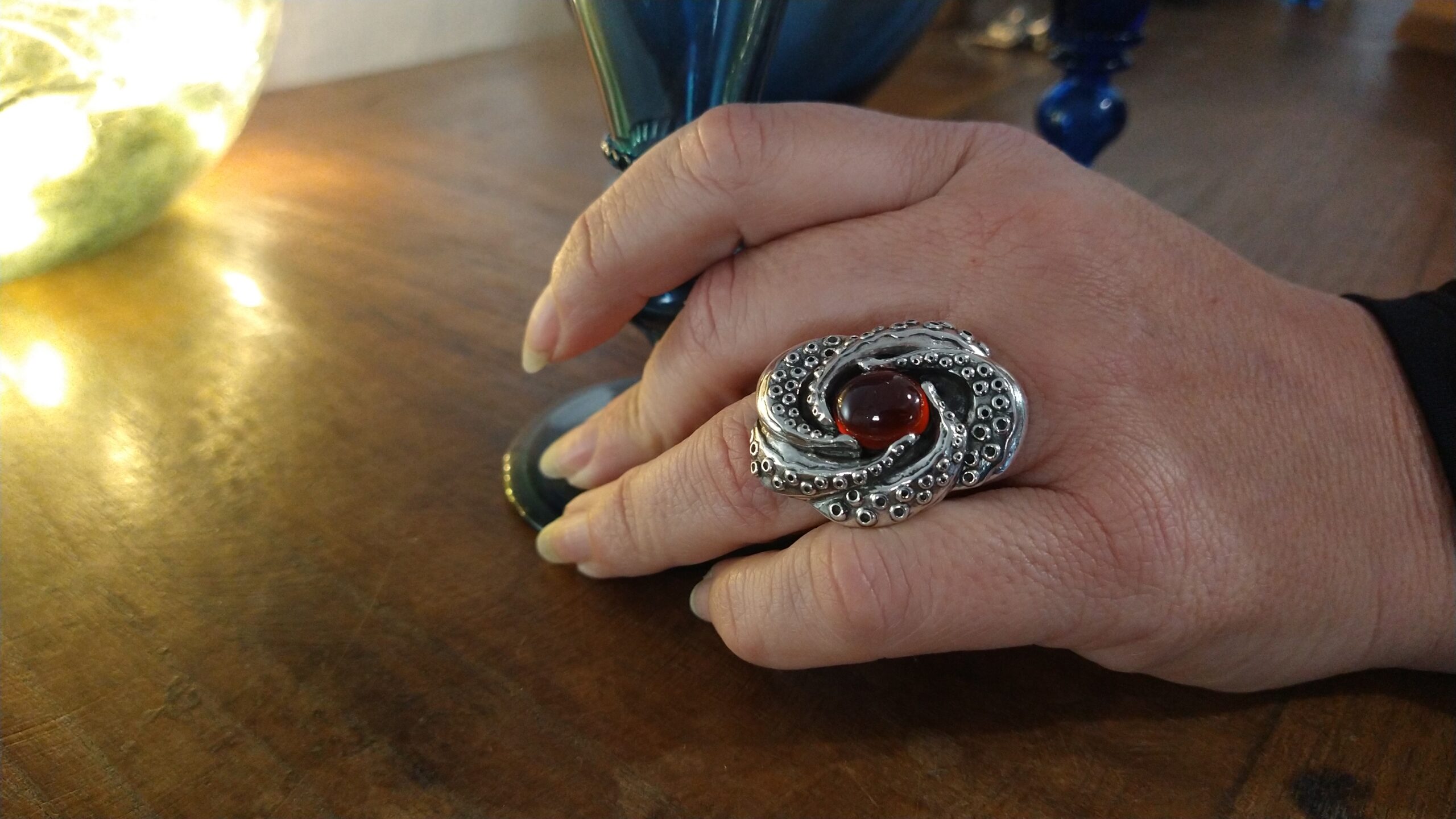 Les tentacules d’argent du monstre dans visage s’enlacent autour d’un cabochon de grenat rouge-orangé, comme pour retenir prisonnière la lueur ardente d’un monde englouti. Cette pierre, flamme figée dans les ténèbres, semble pulser d’une vie propre, rappelant ces clartés sous-marines qui attirent les imprudents vers des destins indicibles. Porter cette bague, c’est accepter l’étreinte des profondeurs, laisser les tentacules effleurer votre peau et vous murmurer les secrets des abysses, ces beautés trop monstrueuses pour être contemplées sans frémir.