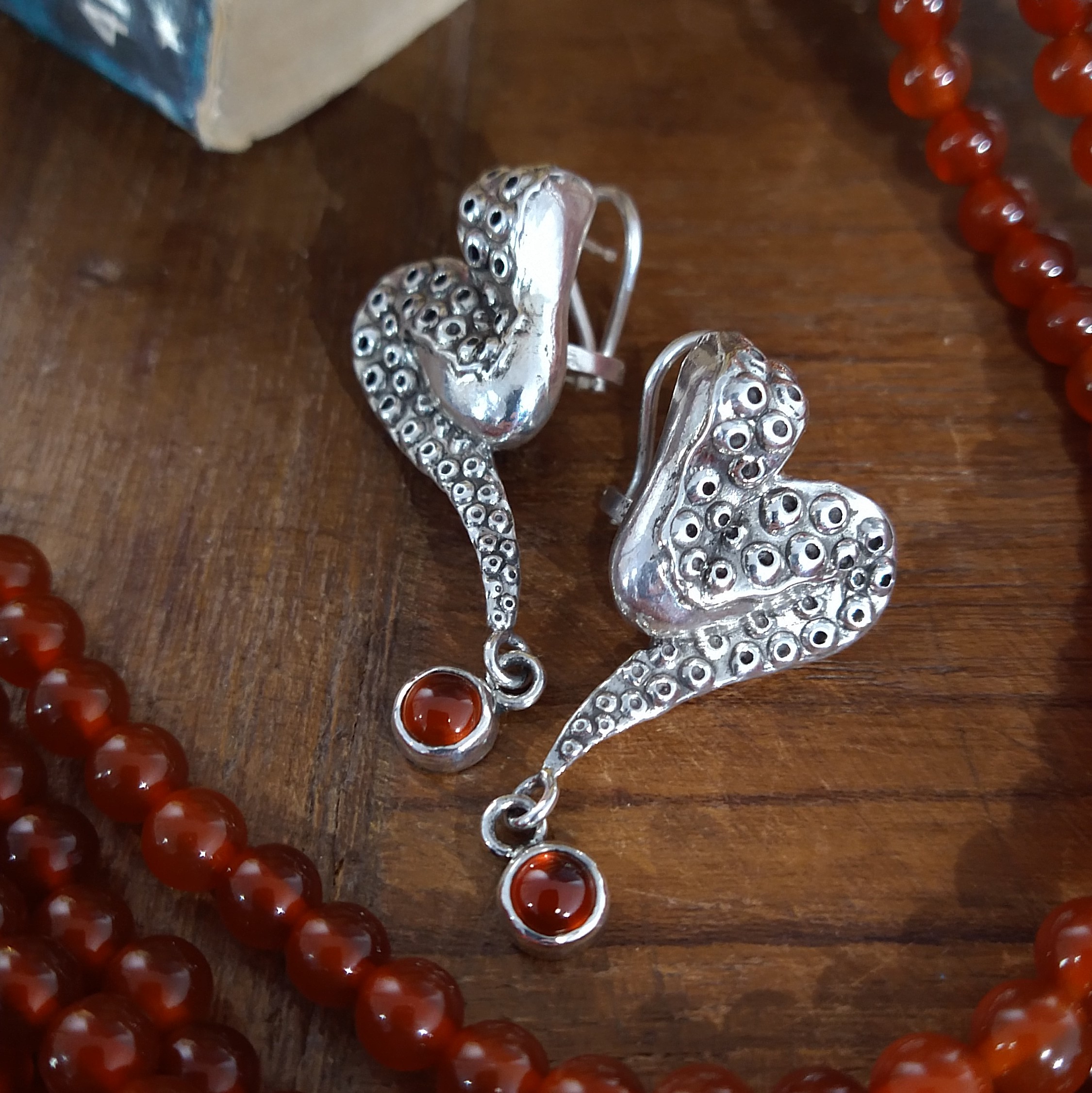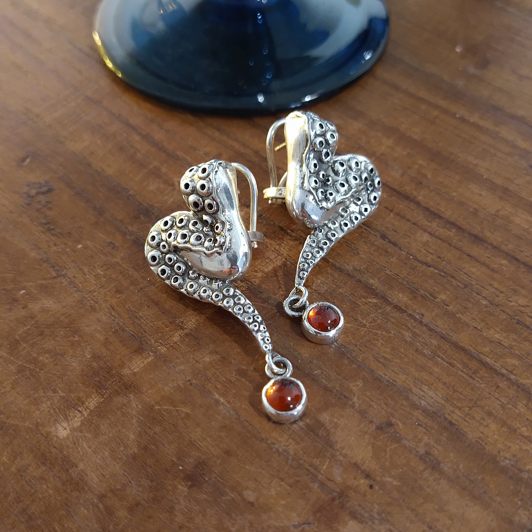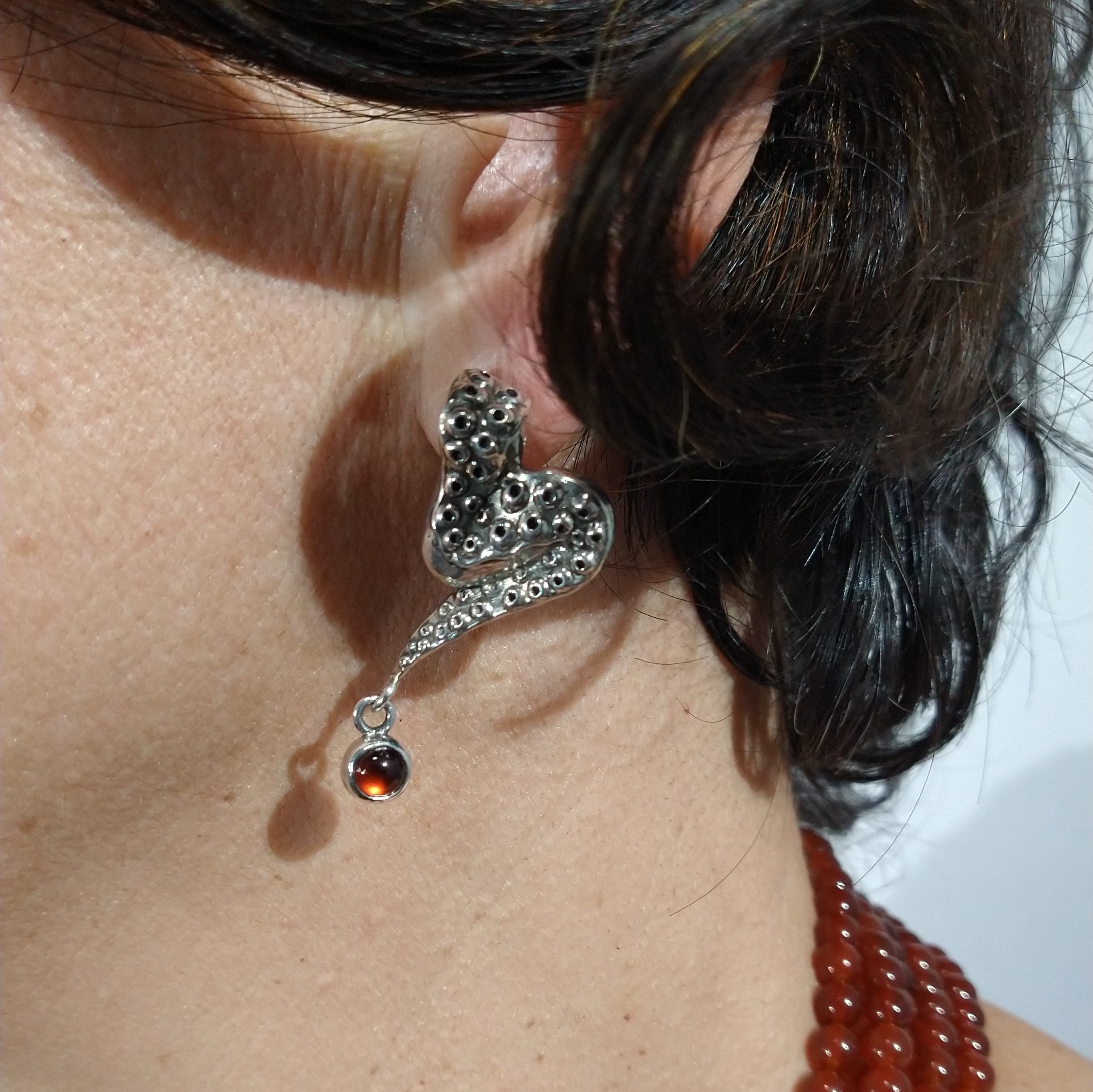 Vous aimez que l’on remarque les boucles que vous portez à vos oreilles ? Optez pour cette paire que l’on ne pourra pas ignorer ! Elle est composée de deux éléments sur tige en argent 925 massif, dont les tentacules ont nécessité des heures de scultpure. Pour accrocher le regard, chacun se termine par un pendant mobile orné d’un petit cabochon de grenat rouge-orangé.