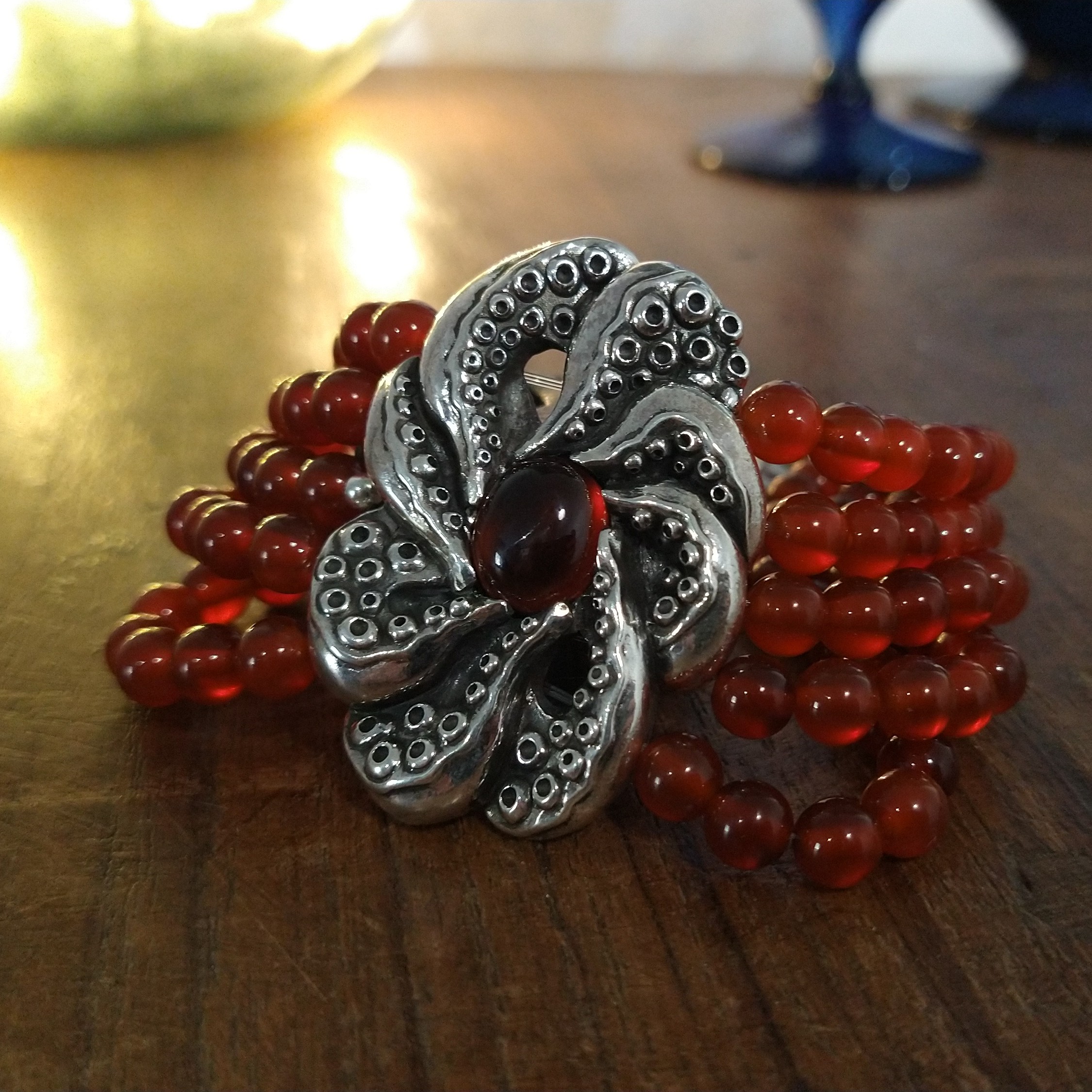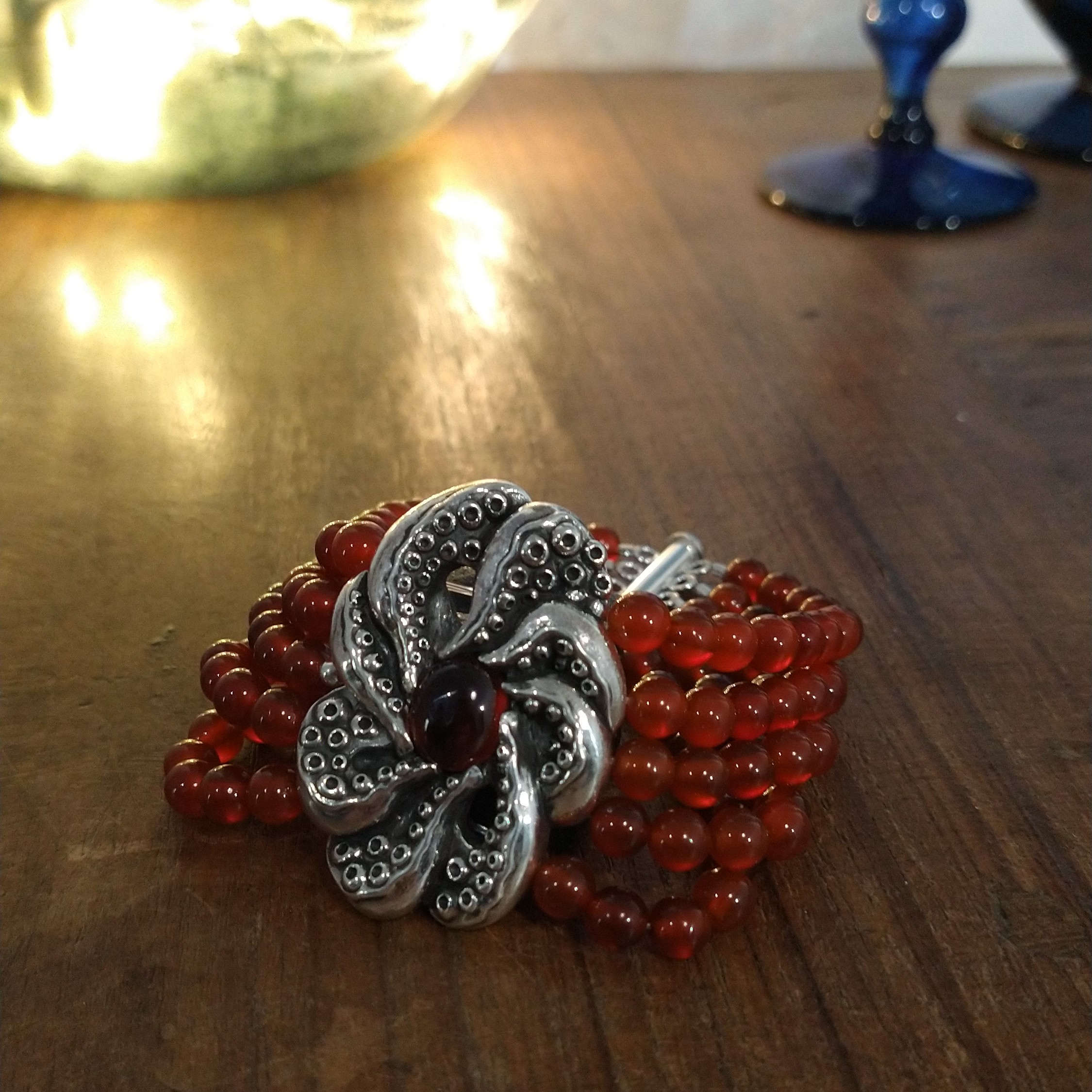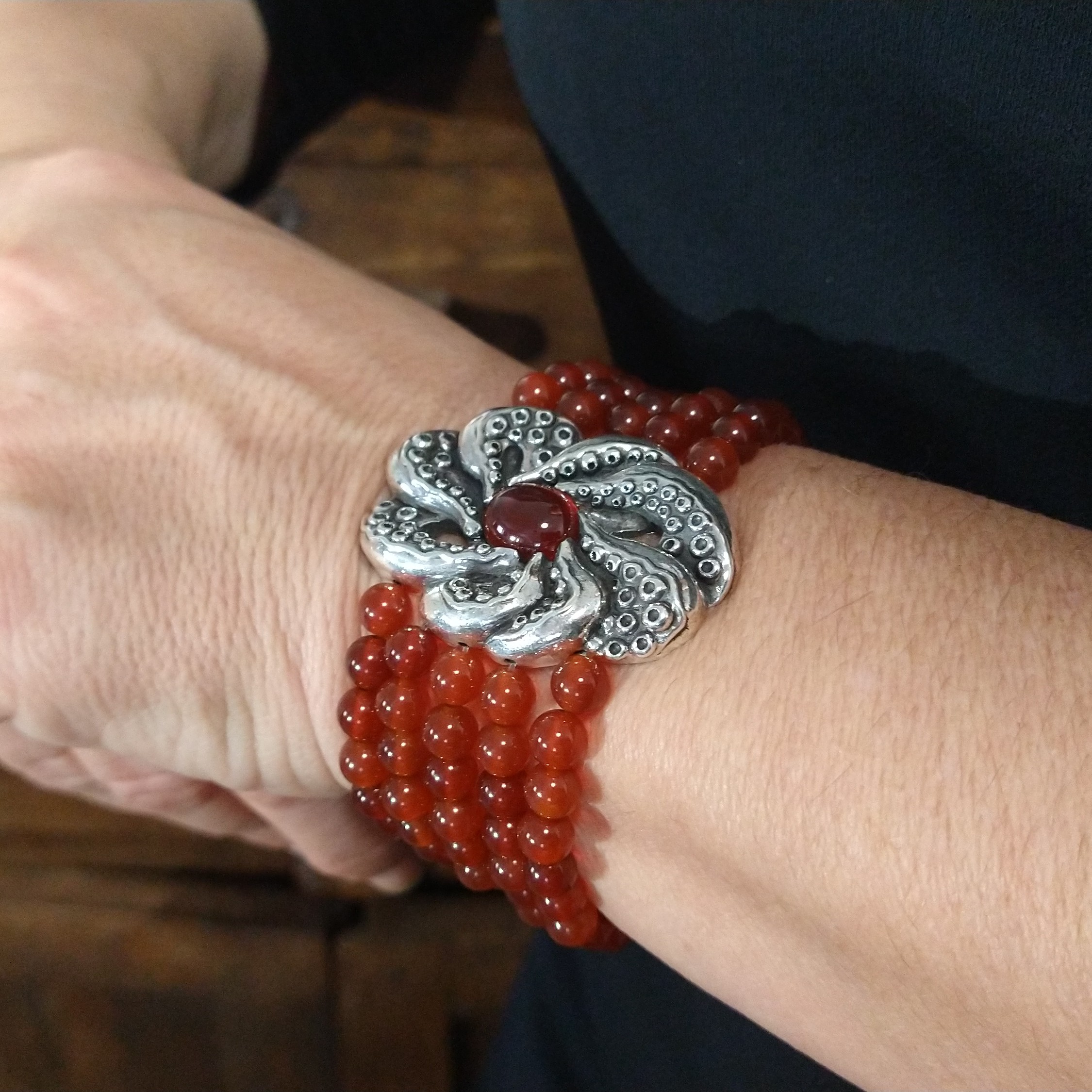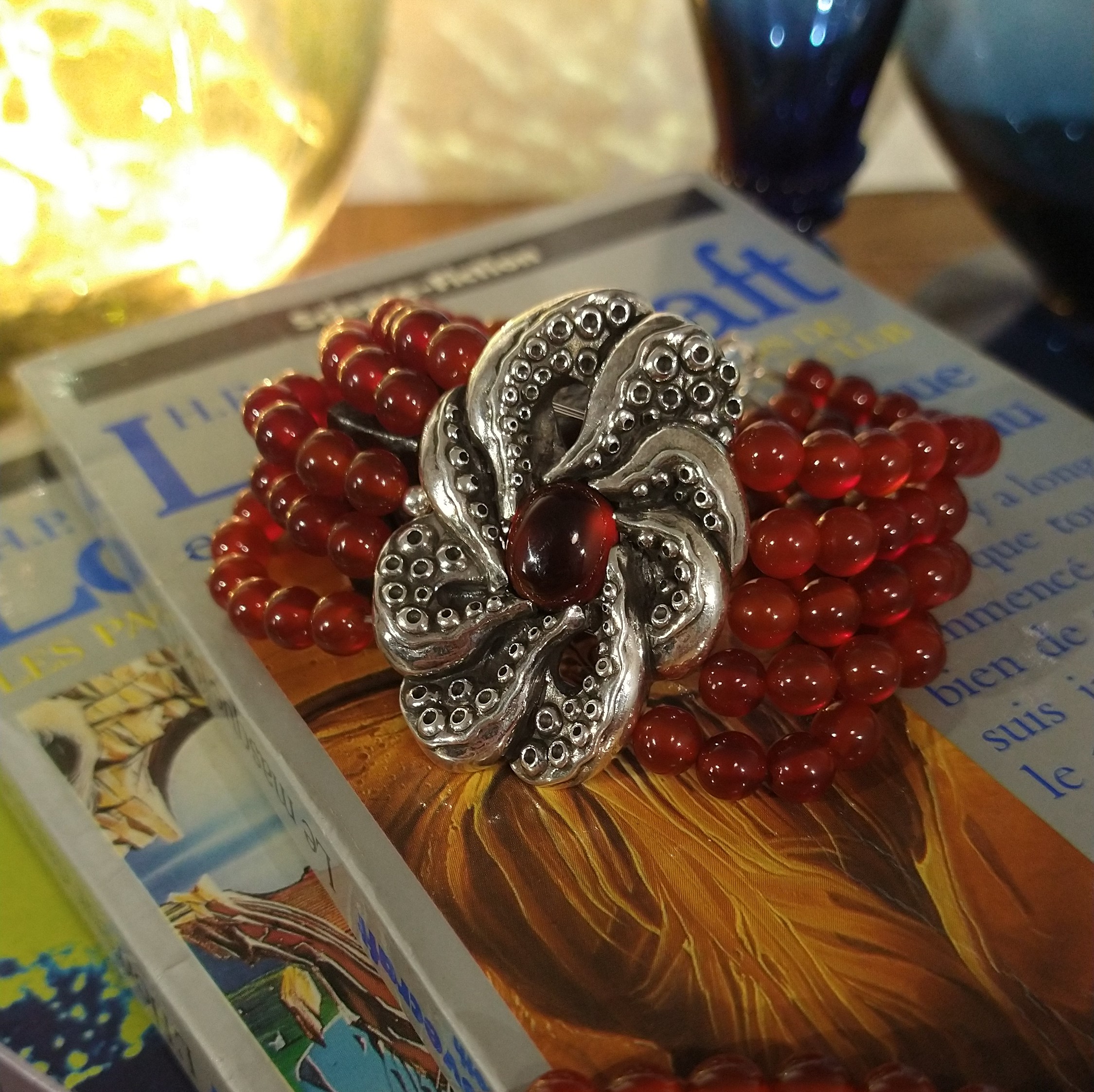 Ce large bracelet est prêt à habiller votre poignet pour accompagner votre tenue la plus stylée. N’ayez pas peur qu’on le remarque, il est fait pour ça ! Il est composé d’un élément central en argent 925 massif, dont chaque tentacule a nécessité des heures de scultpure et dont la clef de voûte est ce beau grenat rouge-orangé en cabochon, ainsi que de cinq rangs de perles d’agate rouge. Son système de fermoir tube en argent 925 est ingénieux car il suffit de le faire coulisser d’une simple pression des doigts pour l’ouvrir et le refermer.