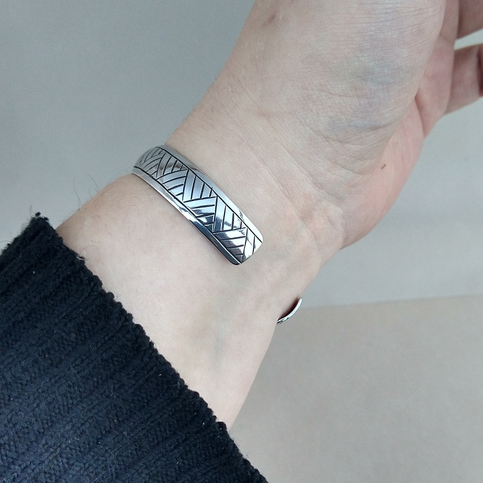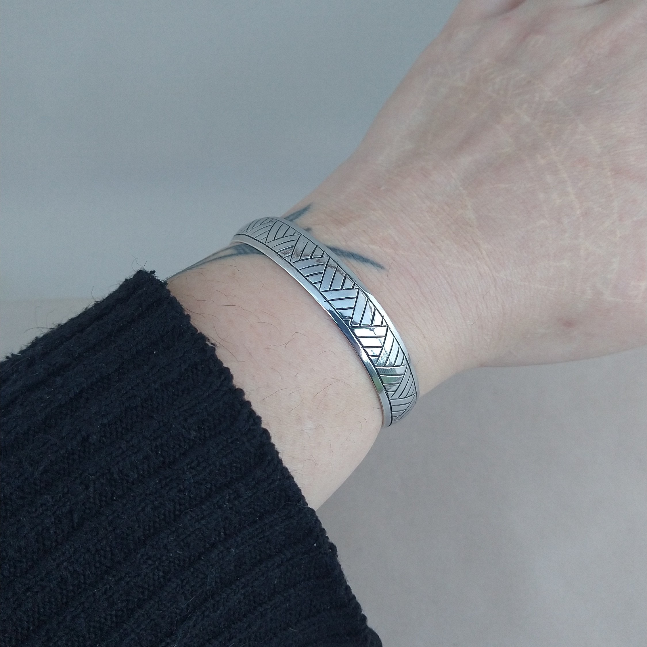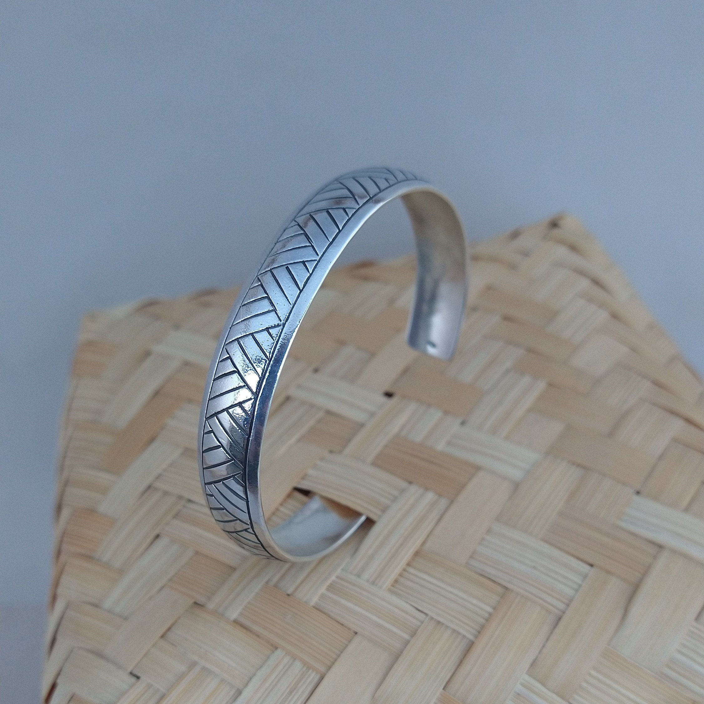 Bracelet rigide en argent 925 massif, motif tressé. Ouvert et réglable.