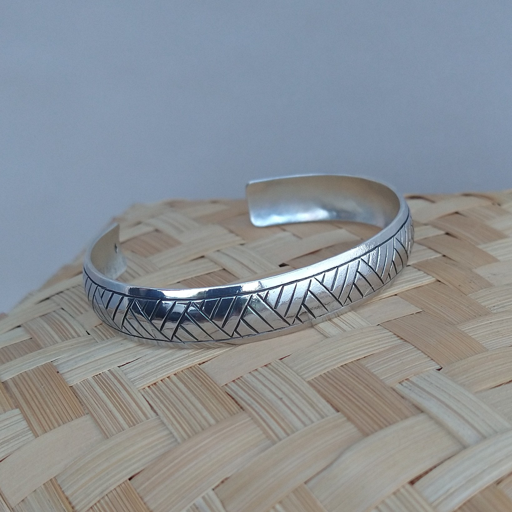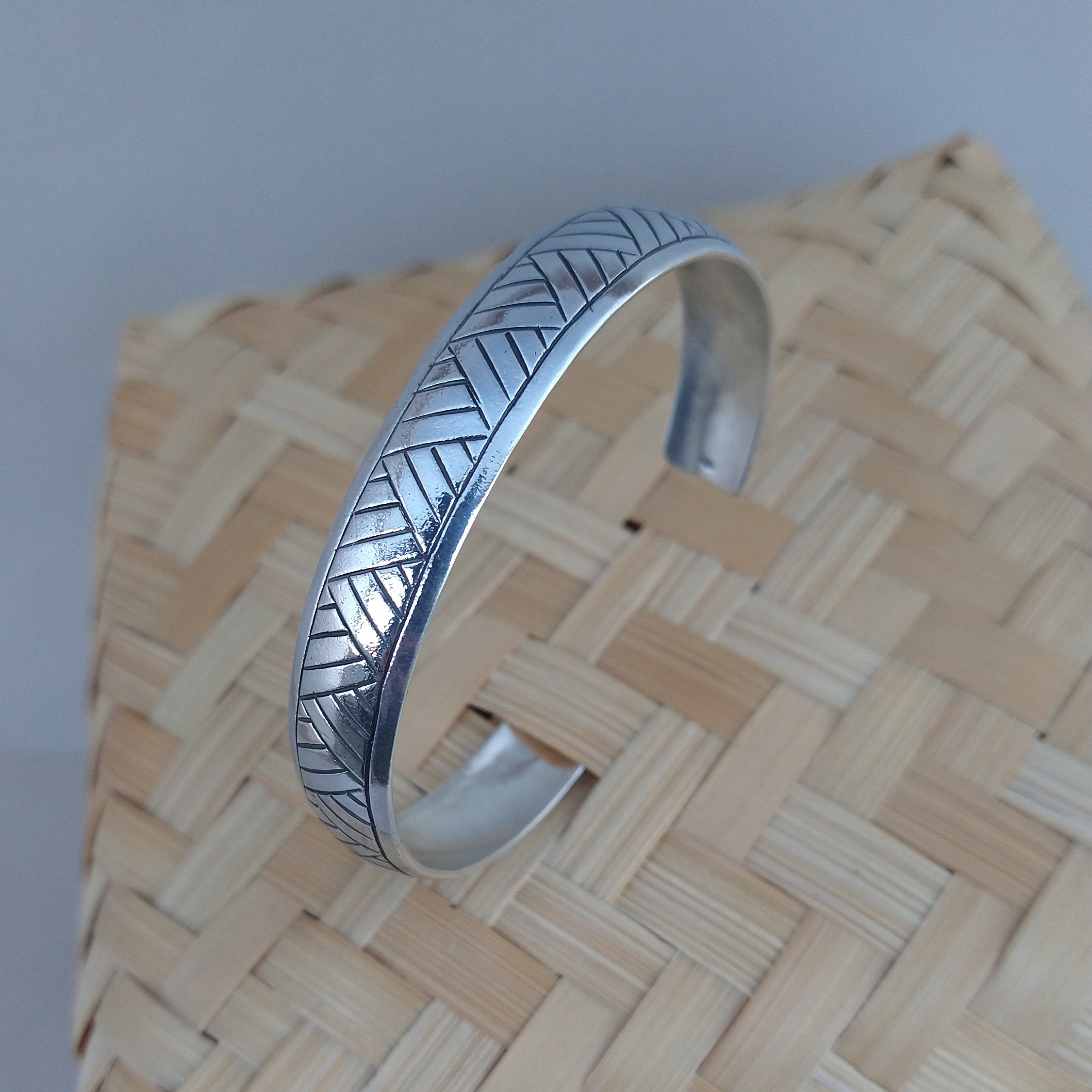 Ce bracelet rigide en argent 925 massif est entièrement découpé, formé et décoré à la main. Cet élégant motif tressé lui apporte un relief et un charme qui s’adapte à tous les styles. Ce bracelet est ouvert et réglable.