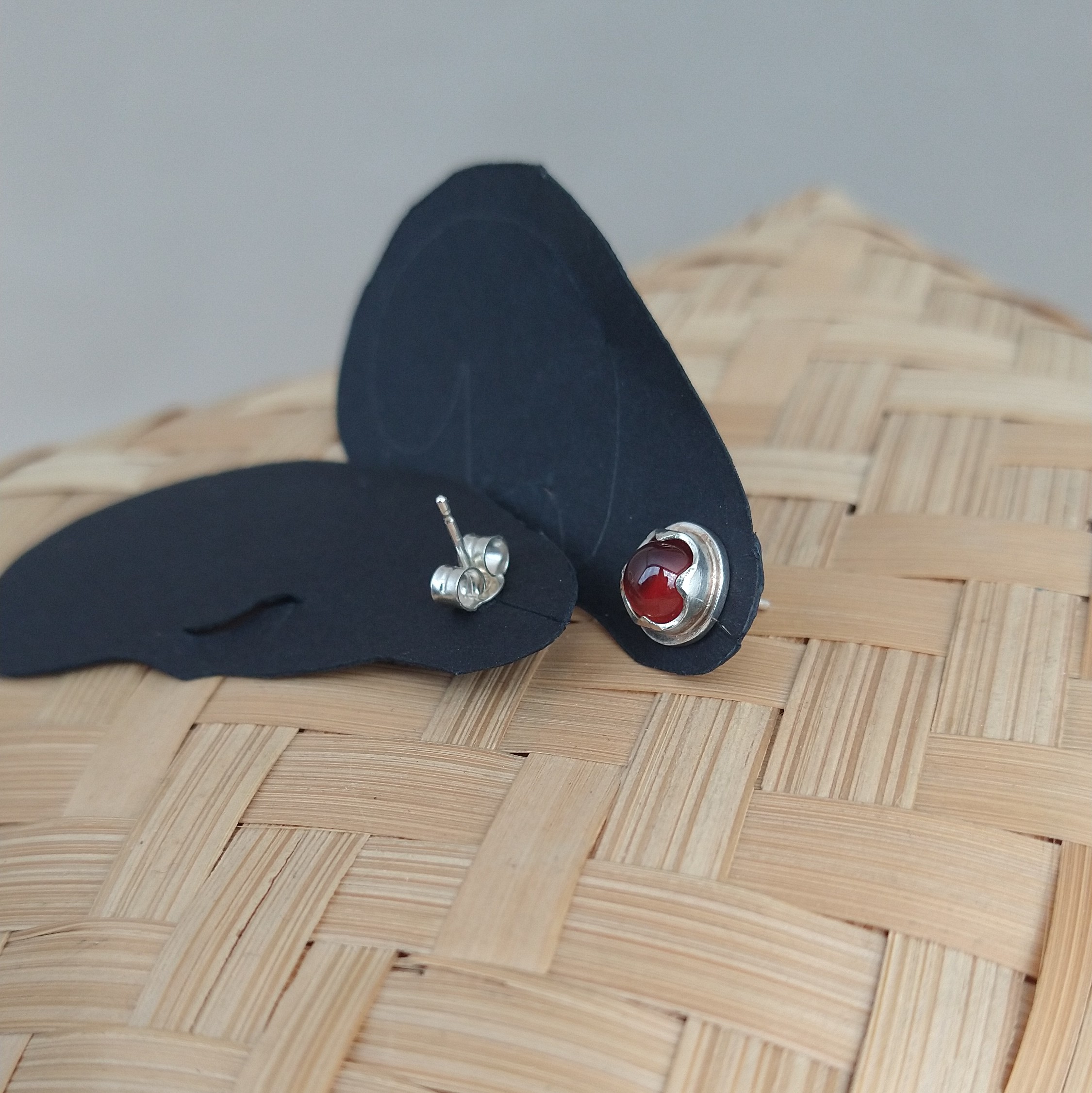 Puces en argent 925 et cabochons de grenat rouge-orangé.